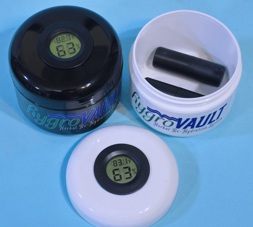 The built in hygrometer shows the humidity of your stuff. The Hygro-Rod when charged with water will keep your goodies dewy for up to a week!